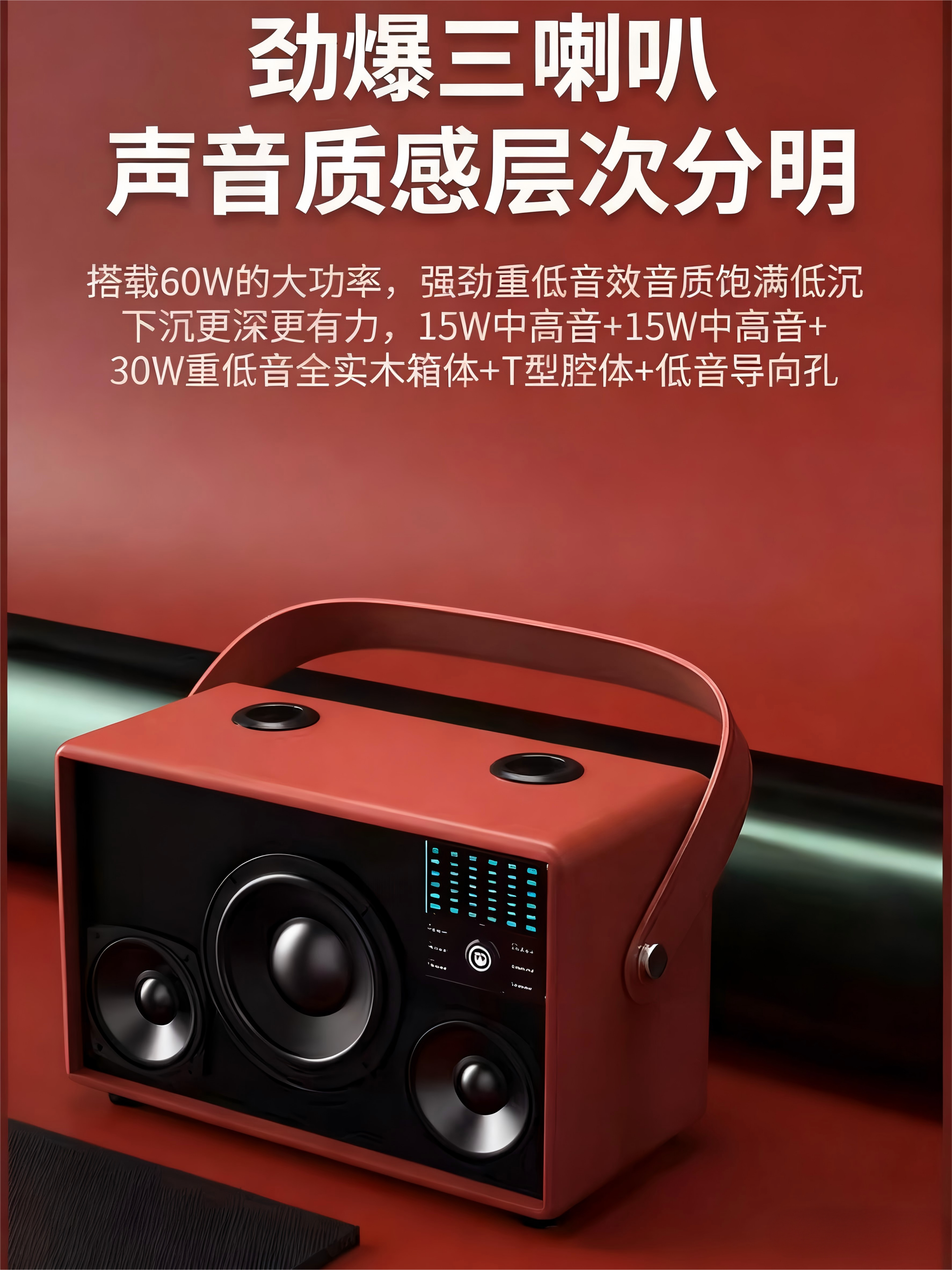 功率达到60W,带一个6.5英寸的超低音喇叭和两个中高音,声卡相当专业,多种声音调节,采用进口6600mAh锂电池,外出使用无续航焦虑。