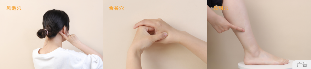 3.再点揉远端穴位:风池穴、合谷穴、光明穴;