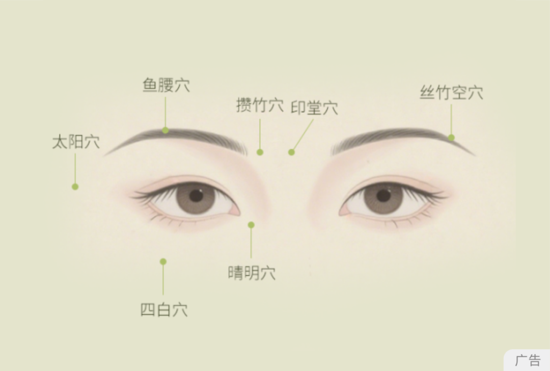 2.用无名指轻轻点按眼周穴位(攒竹穴、鱼腰穴、丝竹空穴、太阳穴、睛明穴、四白穴、印堂)3-5分钟;