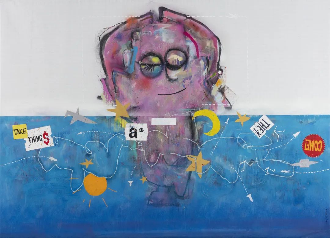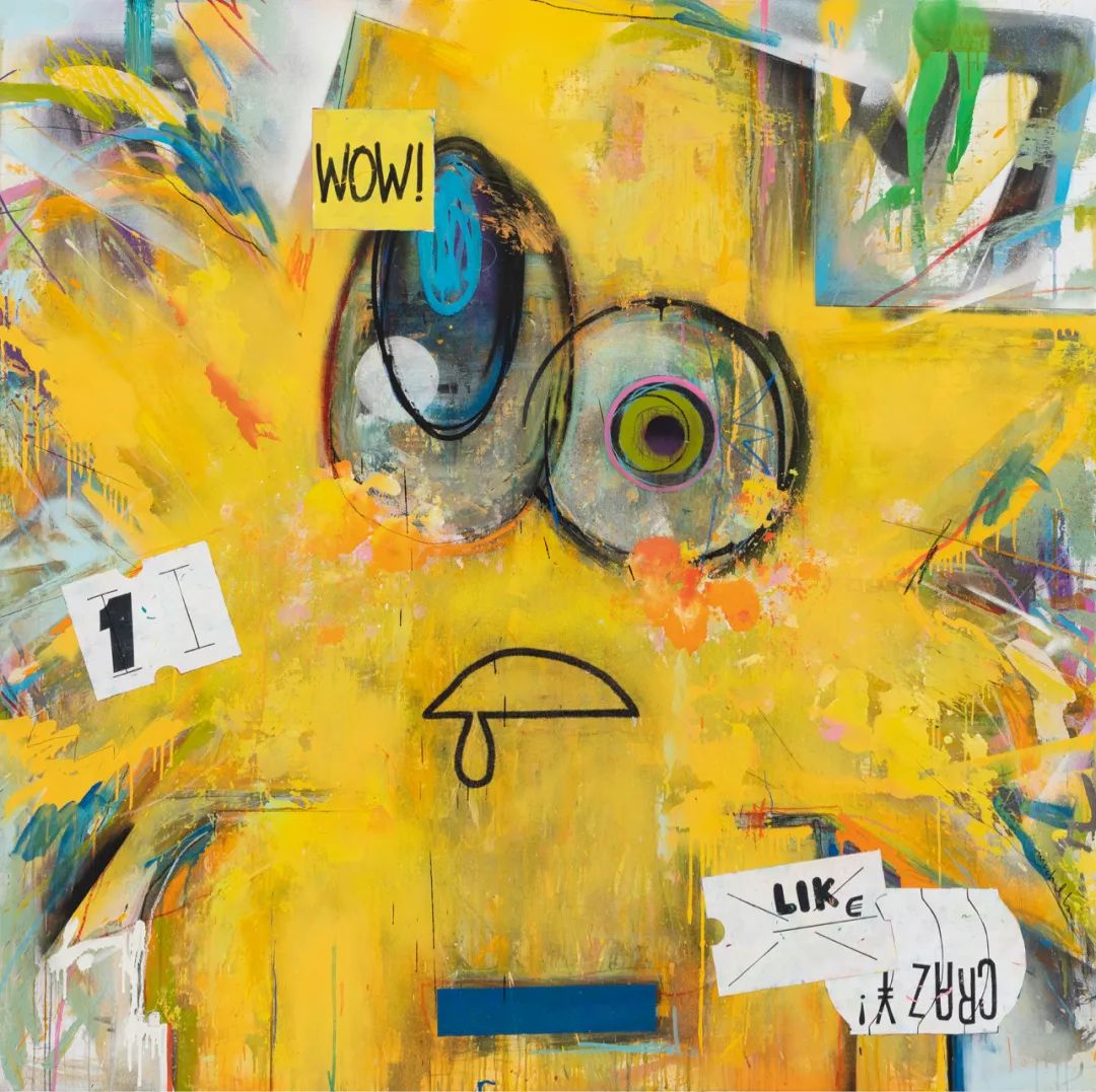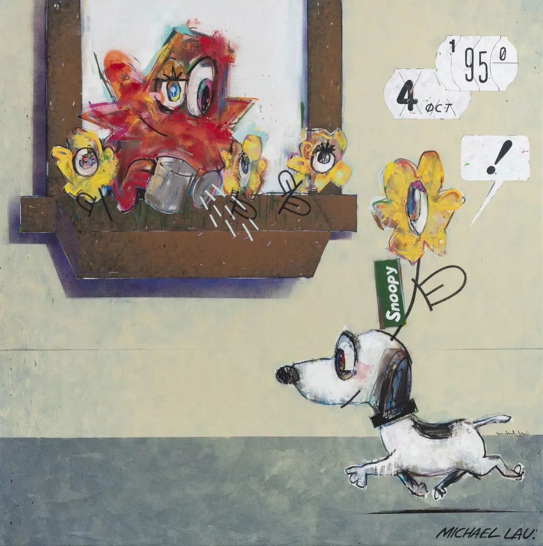画里面的标签巧妙地显示了每幅画的标题,即我们与每个角色“第一次相遇”的日期和时间。仔细观察每幅画中人物的眼睛,揭示了人物在各自故事中的关键伙伴的形象,以传达他们之间的一段亲密关系。这个系列每件作品的画面充满童真与谐趣,欢快奔跑的Snoopy头顶一朵大眼睛向日葵花,瘫坐地上的皮诺曹眼睛闪烁的是睿智的蟋蟀老师,绿青蛙Sam和小伙伴们,玩具总动员的牛仔安迪等,这个系列笔触和色彩都轻松活泼,艺术家在他的“包装变化”系列概念下表达的每个角色都呈现了一种在现代诠释下唤起怀旧感的笔触。其既富当代触觉又感性的处理手式唤起了每个观众对其中所描绘人物的个人回忆。