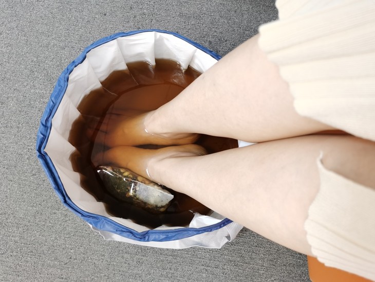 ① 取出「草本足浴包」,将其放置在泡脚桶里;