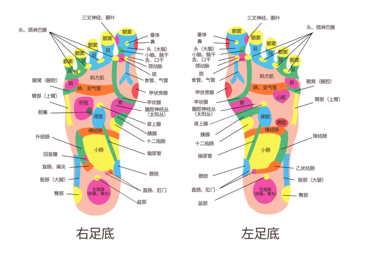中医经络学说认为,人体的经络有12正经和8条奇经,其中6条正经、3条奇经从足部走过,脚是足三阴经的起始点,足三阳经的终止处。人的踝部以下有33个穴位,双脚穴位达66个,占全身穴位的1/10,人的五脏六腑在脚上都有相应的穴位。刺激这些穴位时,刺激的信号会沿经络传导到全身。