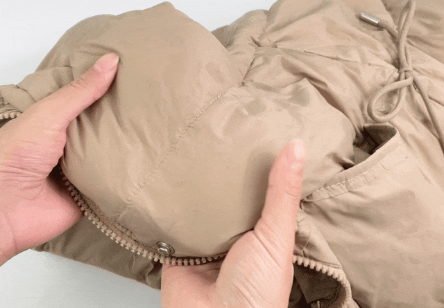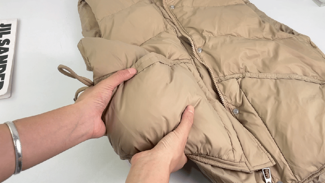 用手轻轻按压,可以看到羽绒马甲蓬松度很不错!