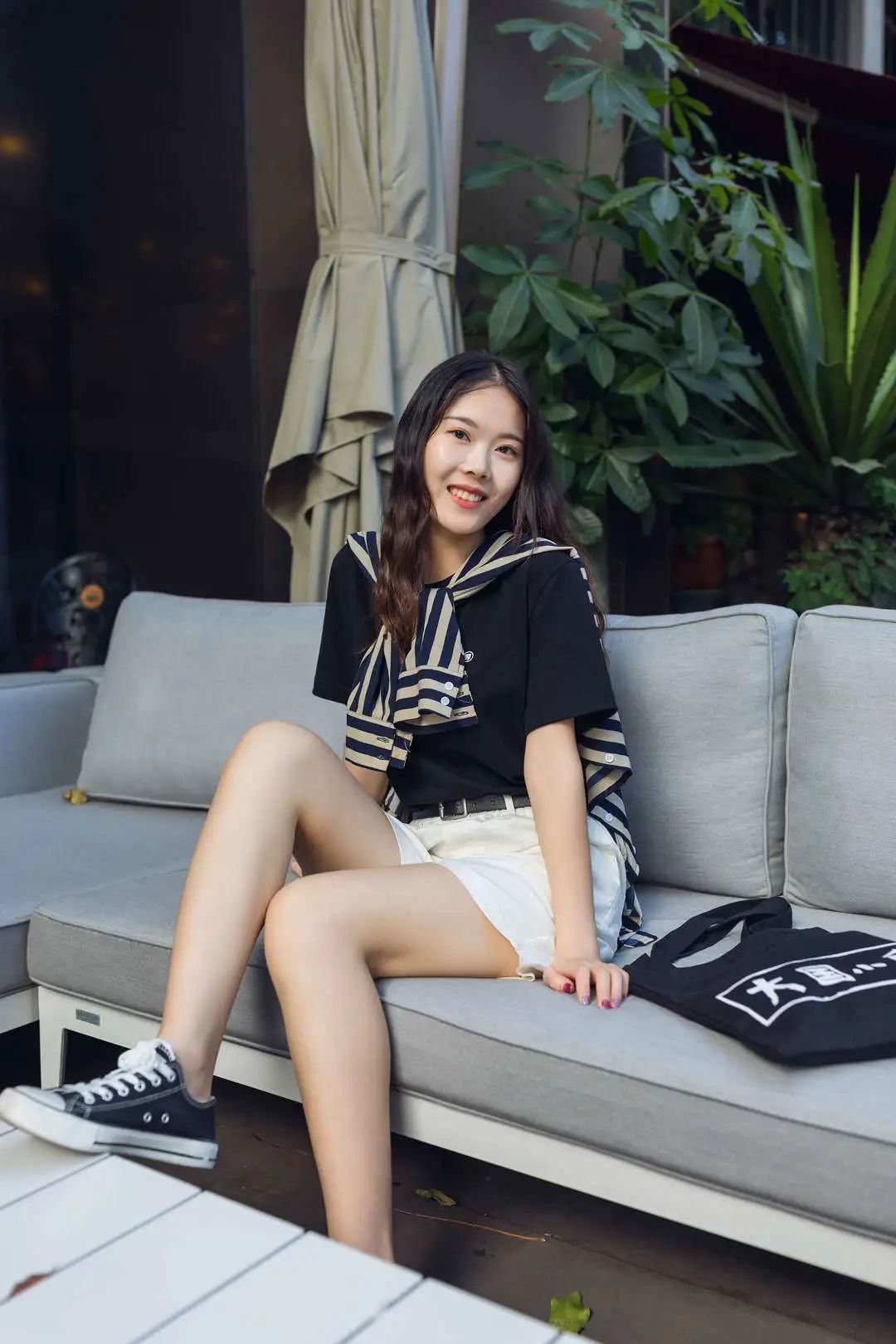 除了单穿之外,T恤作为内搭也非常优秀。而且黑白最适合作为打底色,随便拿一件条纹衬衫作为外搭,解开几个扣子,或者随意在肩上披着,都很显时髦。