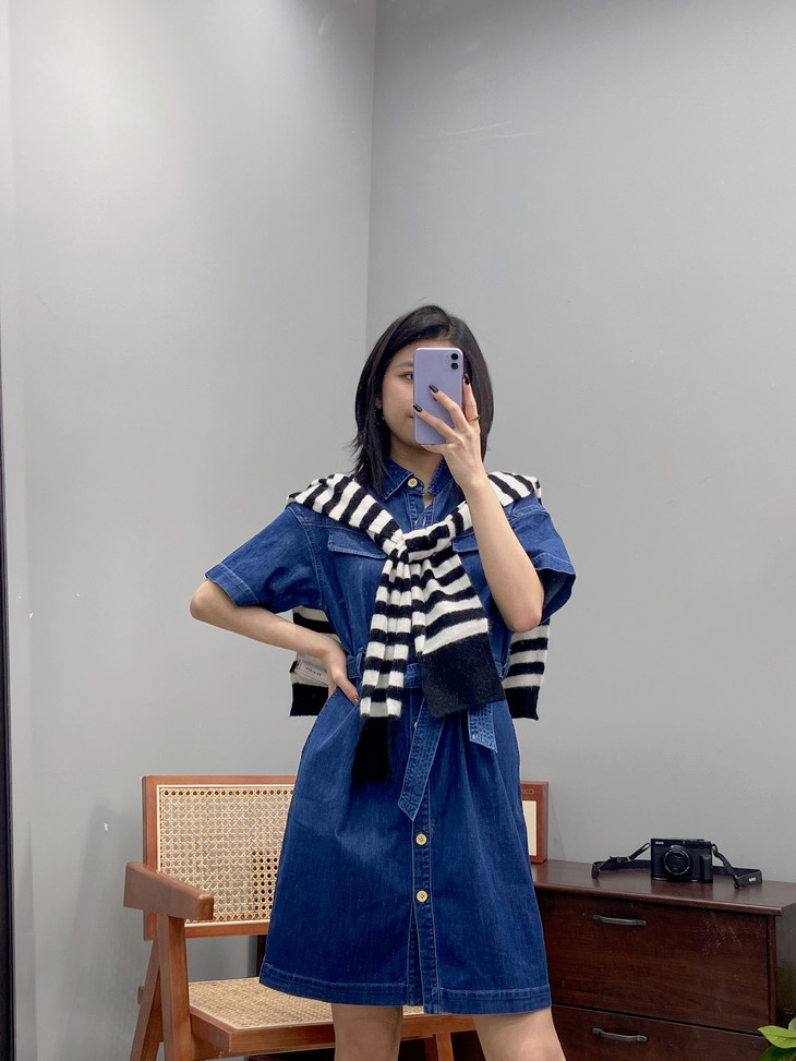 这款牛仔连衣裙将女性的帅气与柔美融合,轻轻松松打造高级的复古时髦感。透气舒爽的丹宁面料搭配短袖款式,能轻松适应春季多变天气,跨季穿着也十分合适。
