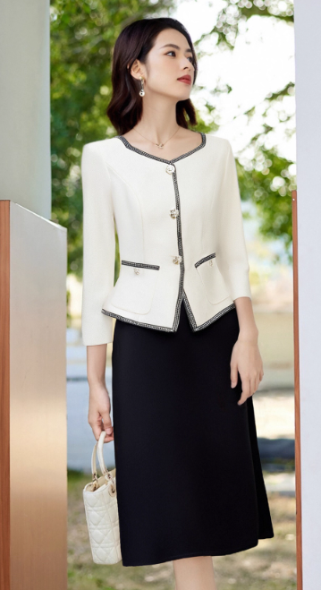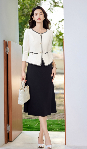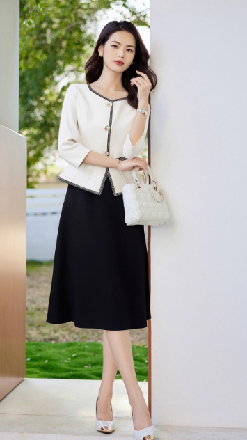 经典配色永不过时,这套假两件连衣裙,职场丽人首选!米白与黑色碰撞,简约又高级。七分袖小香风上衣拼接,勾勒利落线条,精致纽扣点缀,细节拉满✨