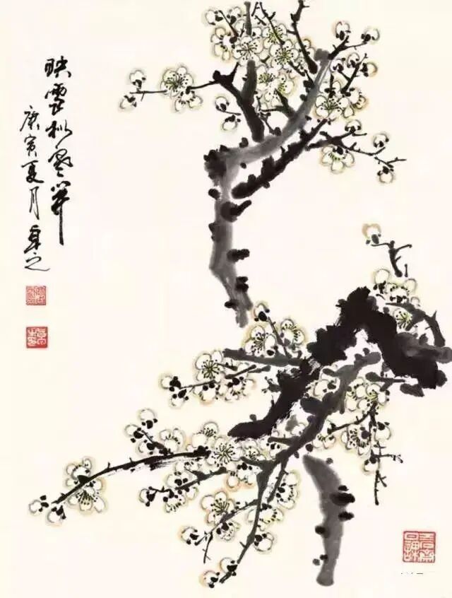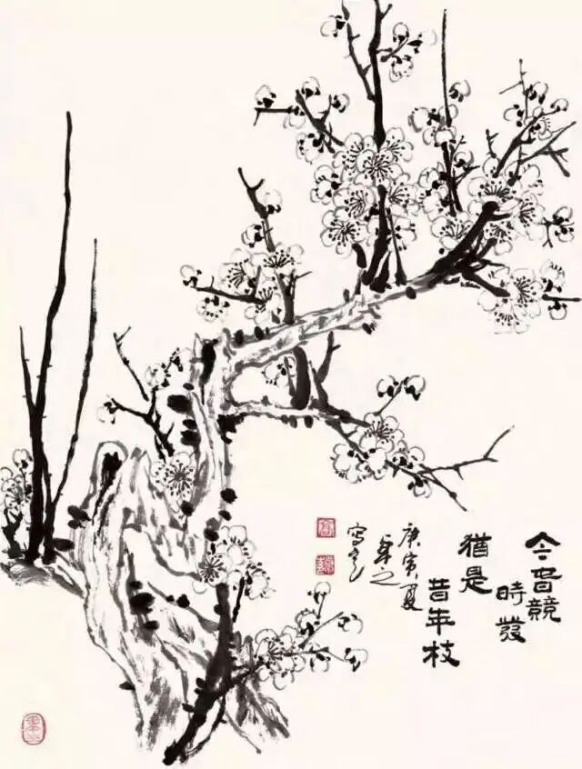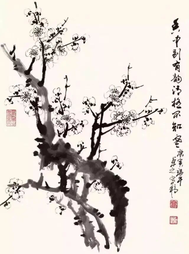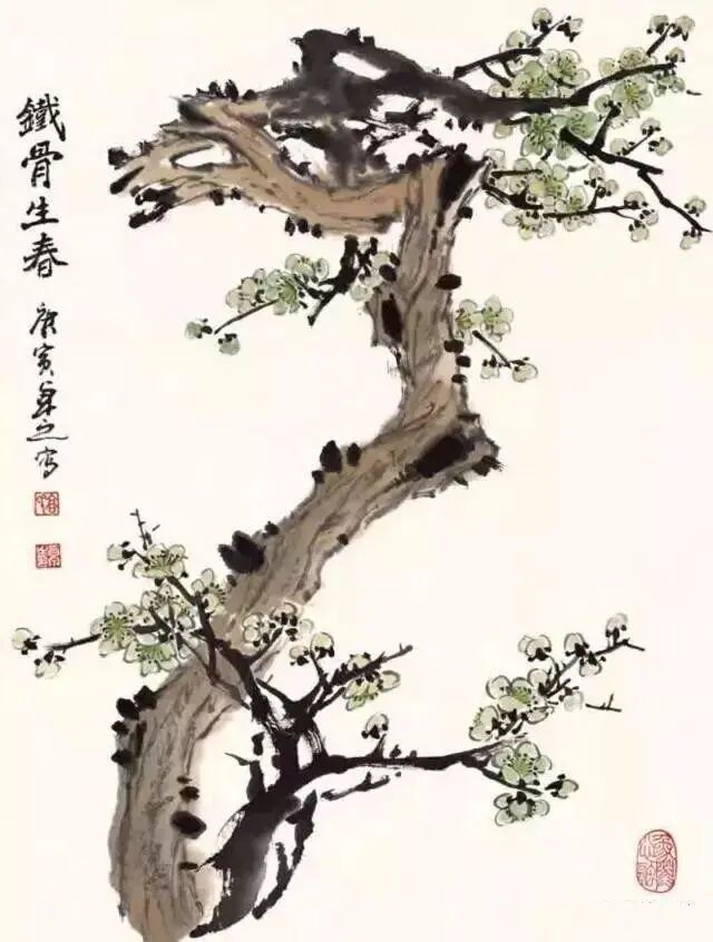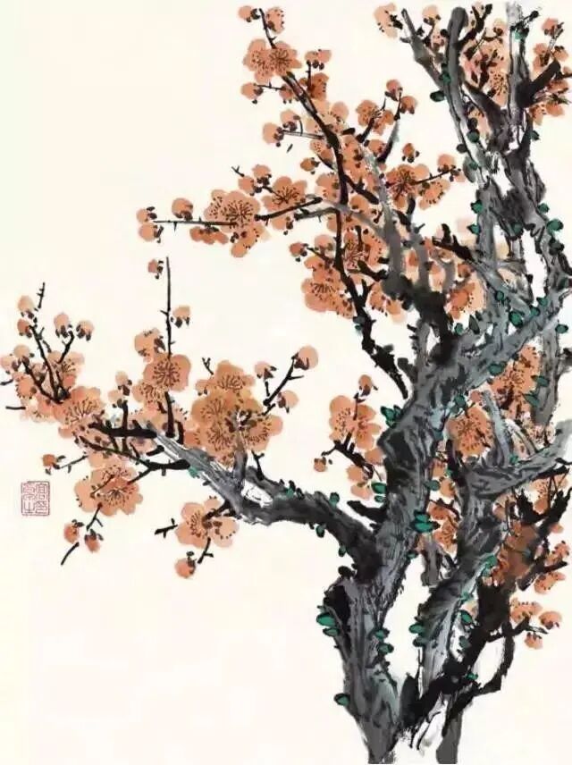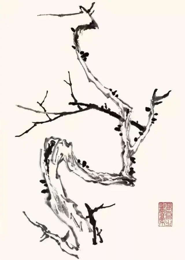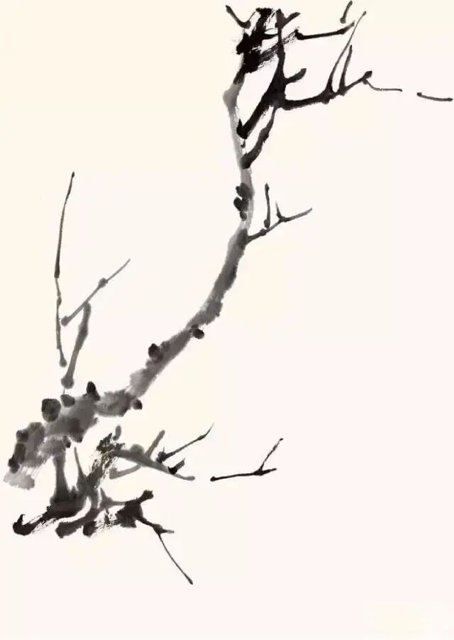 草勾画枝干可以用色或墨填染,亦可先用较淡的墨或色墨以泼墨法画出大枝干,待半干时以重墨草勾并简皴完成(也称破墨法)。小枝可直接用重墨画。画新枝直条是不着花的枝条,这也是梅花的特点。掌握了梅花枝干的各种画法,其他木本花卉的出枝就容易了,因为出枝的技法是相通的。