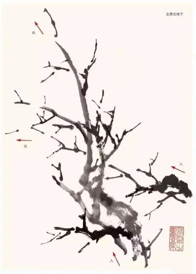 小枝一般是生花的枝,因此画小枝不能一笔贯到底,要适当留出画花的位置。在整幅画中,花的疏密安排也需要在出枝过程中作通盘的考虑。画梅出枝干,在画面中也有势的取向,在纸的边缘入笔处即为入势,有入就有出,小枝顶梢所指方向即为出势。
