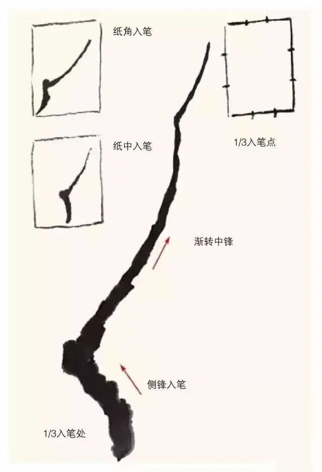 出枝干第一笔要知道在纸上下笔的位置,一般来讲,应从纸边的1/3位置入笔。此处入笔相比较纸角处或纸边中央处入笔在视觉上感觉舒服。这也与西方绘画“黄金分割线”的位置基本接近。这个位置在画花鸟画中都是适用的。