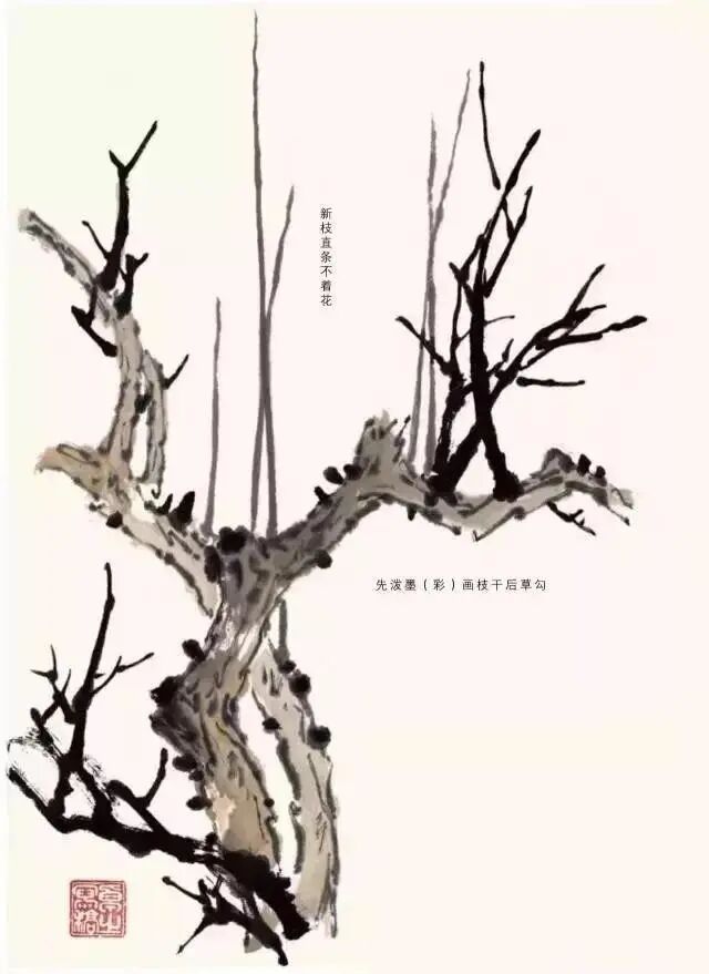 简勾带皴表现老干,重墨画枝,此图只是作一示范。