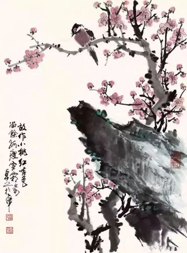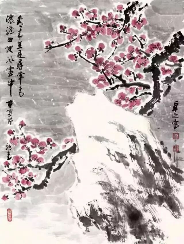 用浓淡的墨画枝和干,与画面中厚重的石头形成线与面的对比。淡墨勾梅花点染淡胭脂,以胭脂墨点萼勾花蕊,色彩上较为协调。