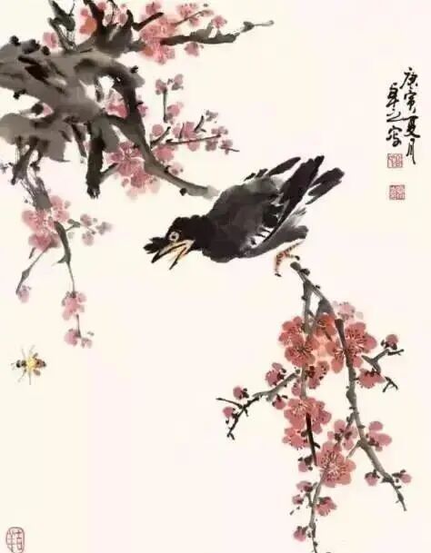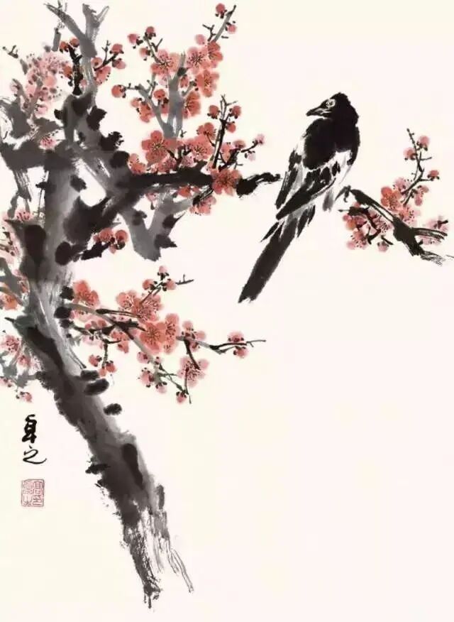 这幅是以黑色八哥鸟为主的构图,鸟占有主导位置,而梅花只着重一枝,左上角的枝干与花画得较虚,为的是不与主体争位。梅花在此图中不是主角而是配角。