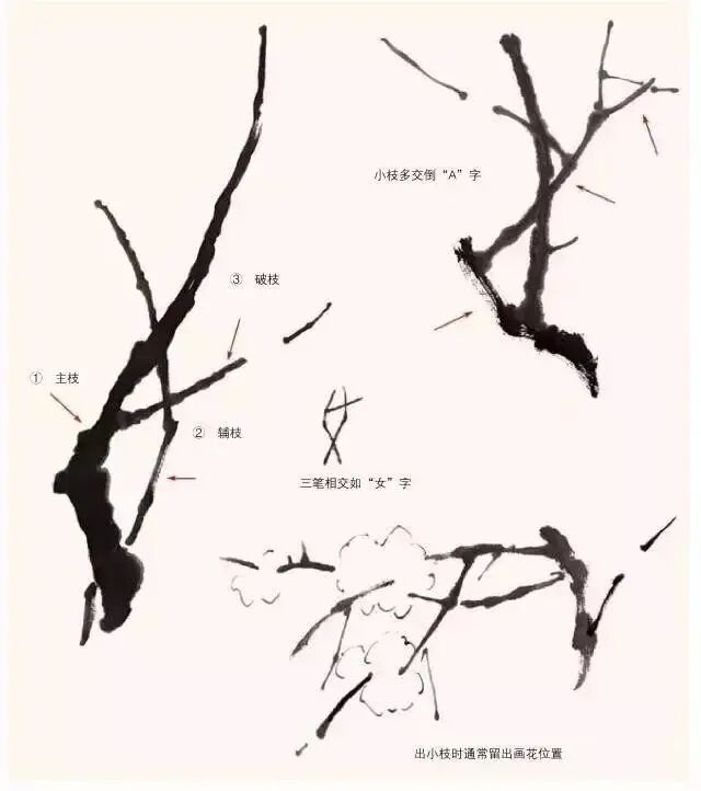 梅的干与枝都有主、辅、破的穿插,这样才能丰富枝干。为了便于掌握,不妨将画枝看成大写英文字母的倒写“A”字。