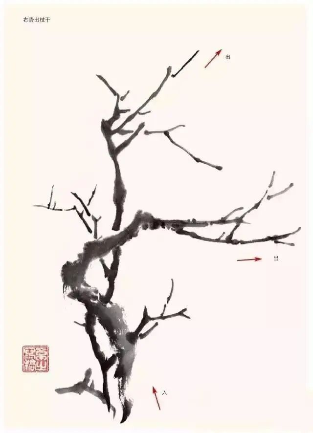 画梅应先从出枝入手。出枝讲的是画枝干,枝干穿插得当,笔墨用得好,整幅梅花即完成了大部分。关于出枝,古人有“无女不成梅”之说,用书写的“女”字较为形象地说明枝干的交叉、组合。学画枝干,必先从第一笔枝干练起。