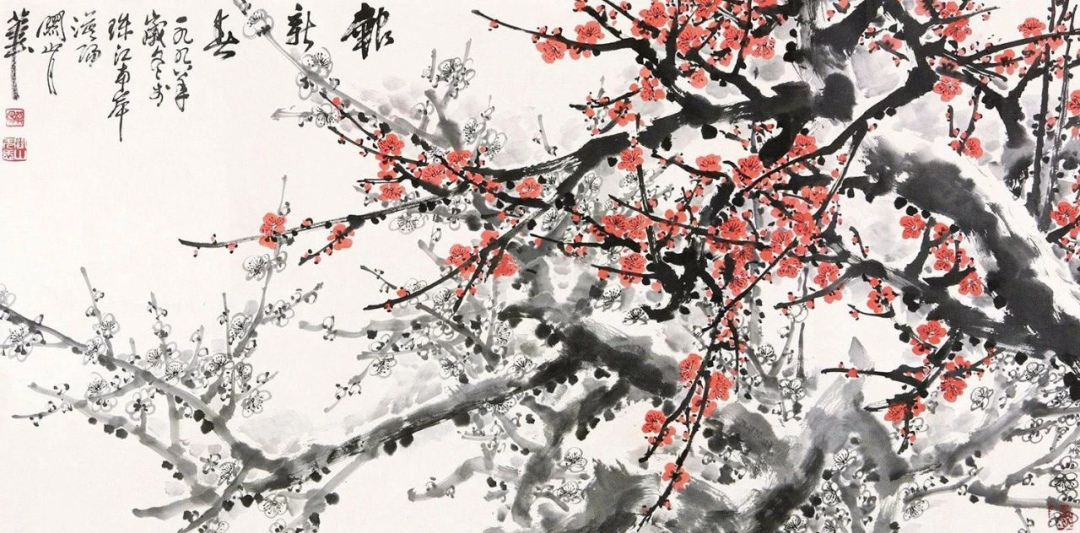 泼墨法画枝干,草勾法画梅花,全幅以墨色的浓淡表现。