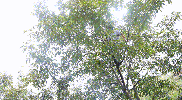 打核桃的师傅一鼓作气,不一会就到了树顶,那身手灵活的,没几十年经验根本做不到。
