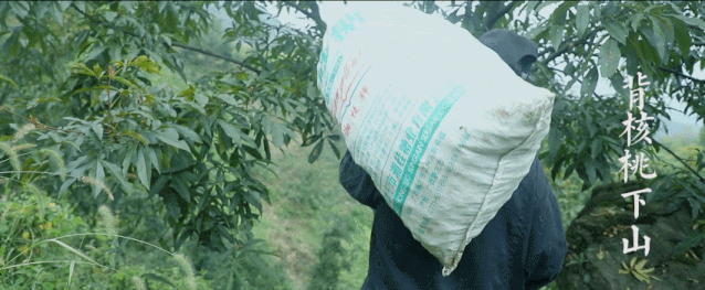 打下来的核桃一一装袋后,全由师傅们一袋袋徒步背下山,整整2小时的山路。