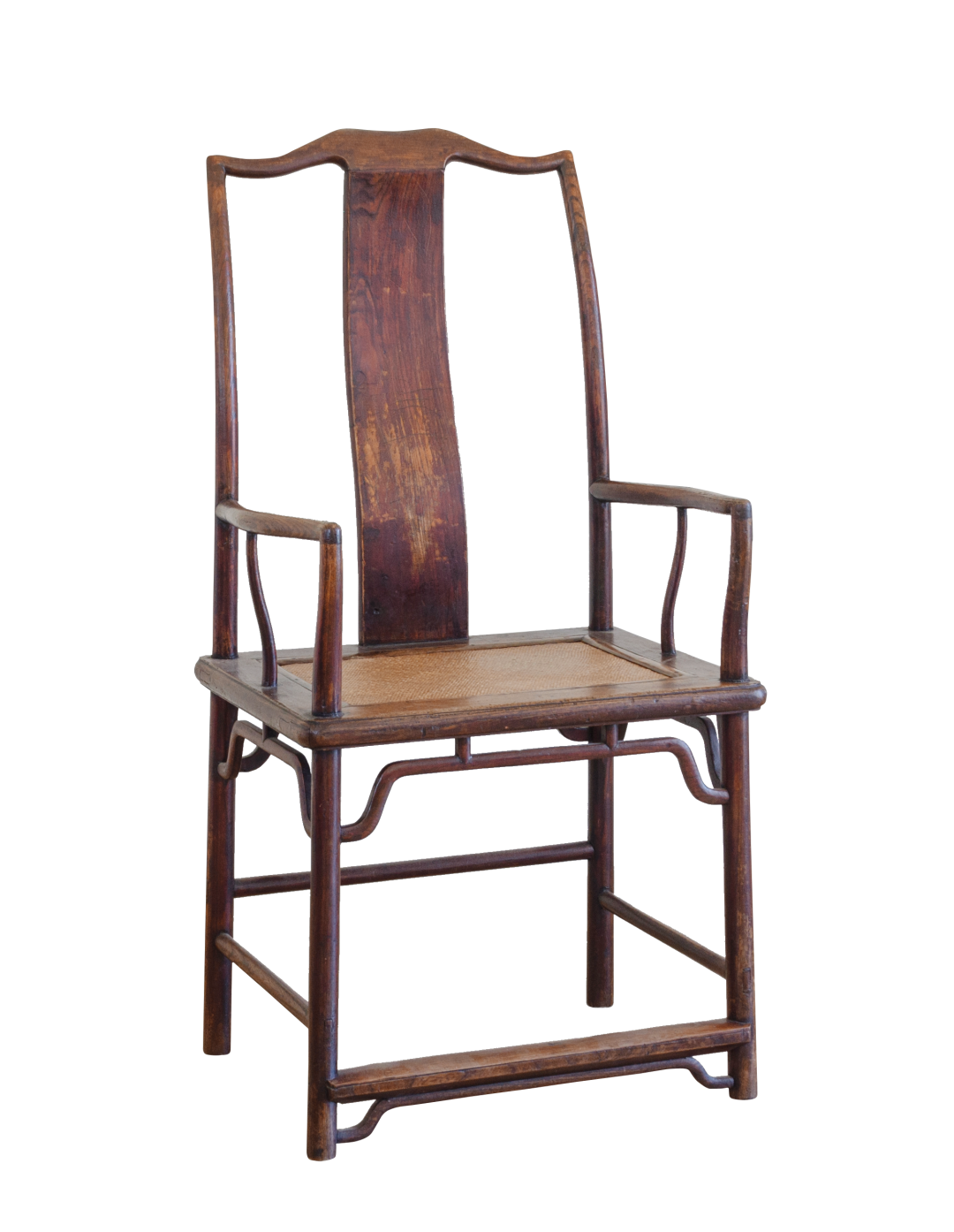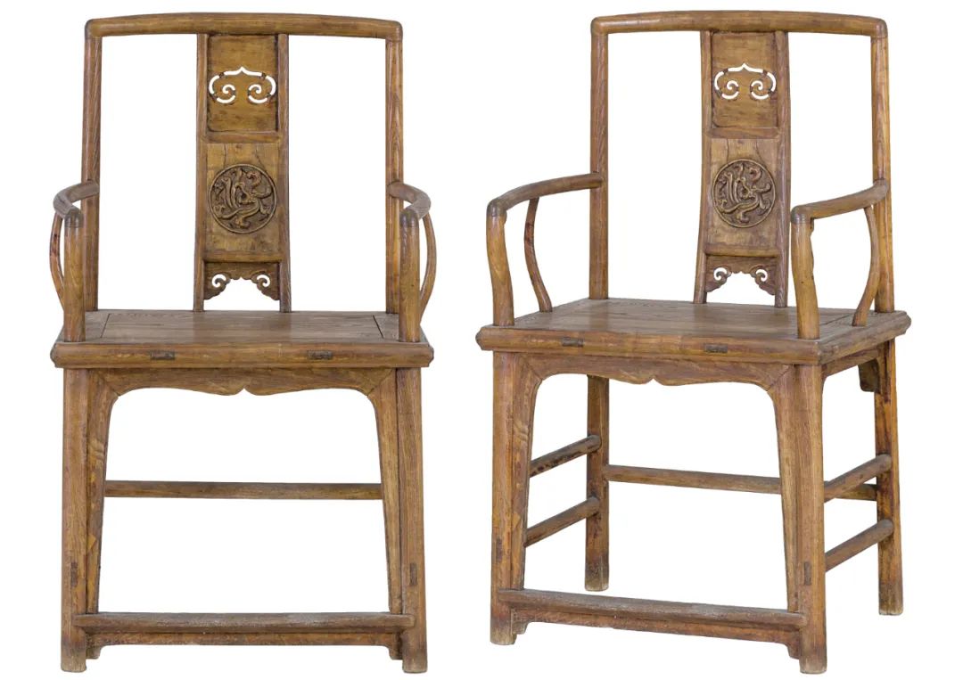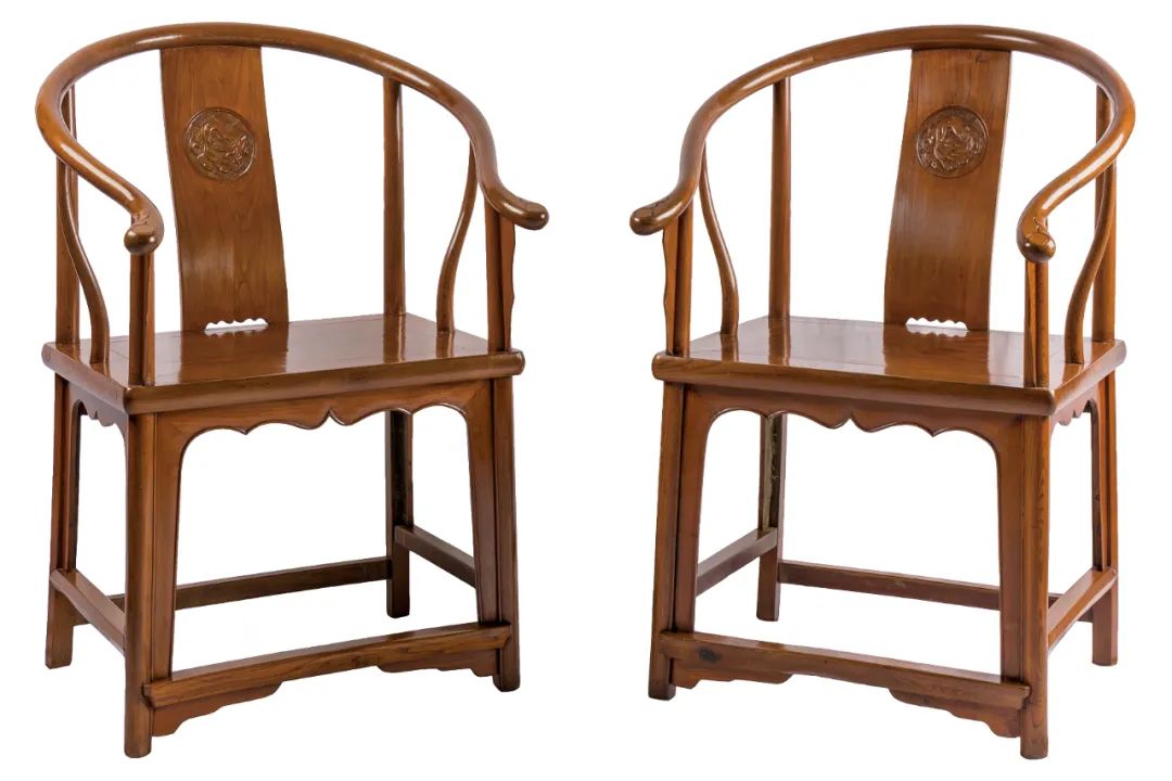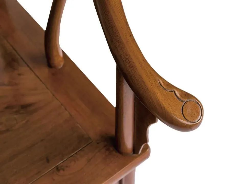 三、就地取材,风格鲜明。细木家具,多就地取材。地方工匠对当地树种、材性、强度、韧性和色泽都十分了解,因此甚么家具用甚么木材,同一件家具,如何配搭不同木材,久而久之,已有一定习惯。此外,造型线条多依从当地风尚喜好,诸如用材粗幼,外形风格,也有一定规律。藏品22榉木螭龙纹圈椅,采用江南一带常见的榉木,造型轻巧,风格纤巧婉柔,充分展现出江南苏作家具的特色。又藏品14榆木南官帽椅,采榆木制作,搭脑和背柱接合处虽然同样以烟斗袋榫接合,但榫头不像江南家具做工,做为圆角,而是向上翘起,形态类近屋宇飞檐,展现山西家具地域色彩。这些带有不同地方色彩的细木家具,让我们窥见中国古典家具样式一些细节变化。