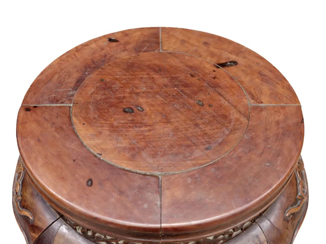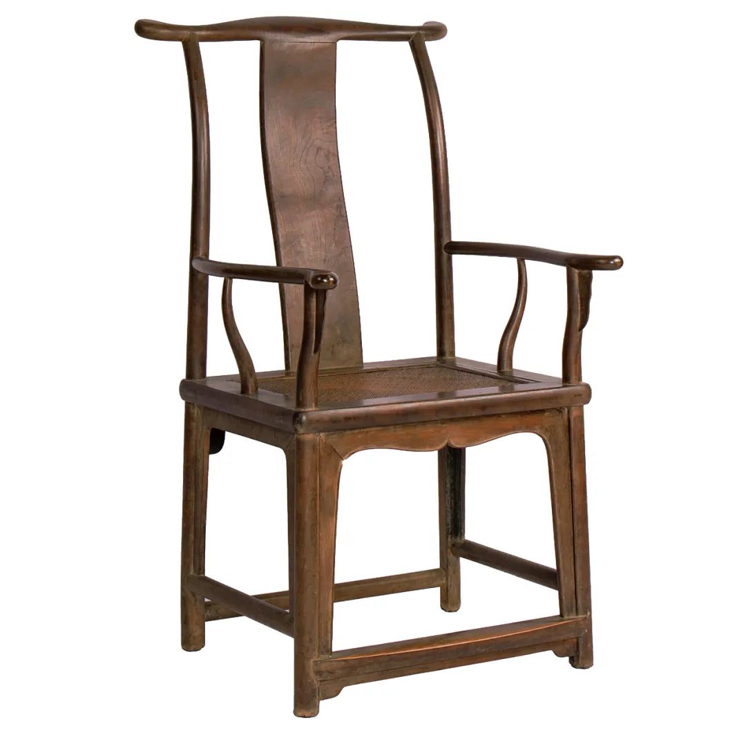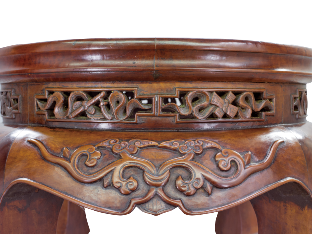 三、就地取材,风格鲜明。细木家具,多就地取材。地方工匠对当地树种、材性、强度、韧性和色泽都十分了解,因此甚么家具用甚么木材,同一件家具,如何配搭不同木材,久而久之,已有一定习惯。此外,造型线条多依从当地风尚喜好,诸如用材粗幼,外形风格,也有一定规律。藏品22榉木螭龙纹圈椅,采用江南一带常见的榉木,造型轻巧,风格纤巧婉柔,充分展现出江南苏作家具的特色。又藏品14榆木南官帽椅,采榆木制作,搭脑和背柱接合处虽然同样以烟斗袋榫接合,但榫头不像江南家具做工,做为圆角,而是向上翘起,形态类近屋宇飞檐,展现山西家具地域色彩。这些带有不同地方色彩的细木家具,让我们窥见中国古典家具样式一些细节变化。
