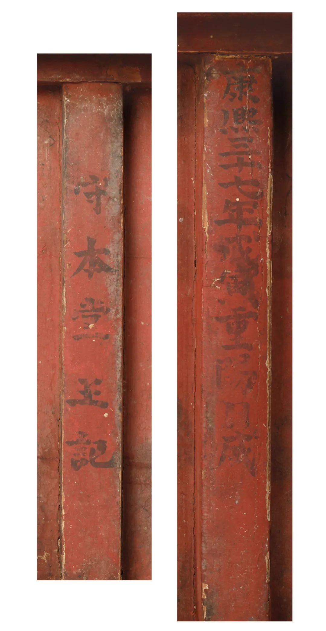 四、带有识款,考证可凭。家具断代从来困难。家具不像字画、陶瓷,鲜有识款,而且家具造型做工,特别是常见类型,如条案、凳子,往往经历数百年也没有显著变化,单凭外形,难以判断时代先后。带确凿年代识款的家具,倍加珍贵。本书藏品53榆木平头案和藏品16椿木矮南官帽椅,皆带有识款。榆木平头案,外形与明代潘允征墓的明器平头案无甚差异,案面下有“康熙三十七年戊寅(1698年)重阳日成”楷书款。椿木矮南官帽椅,属典型明式做工,椅盘下有“乾隆五十五年(1790年)冬置”楷书墨迹,收置年月清楚可见。这两件家具可以给清初明式家具样式和做工提供很好示例,也可以为康熙至乾隆年间明式家具发展提供参考例子。此外,藏品53 榆木平头案,也可跟《中国美术全集・工艺美术篇11・竹木角牙器篇》的黑漆嵌螺钿山水竹物平头案互相印证。该黑漆平头案,表面以螺钿、金银片嵌装山水人物、花卉叶脉等,充分展露清式家具繁富绮丽的风格。该黑漆案面下有“大清康熙辛未年(1691 年)制”楷书款。两张平头案,皆为康熙一朝制品,一简一繁,一为明式,一为清式,风格迥异,有助全面认识康熙年间家具风貌,对探索清初家具流变有所裨益。