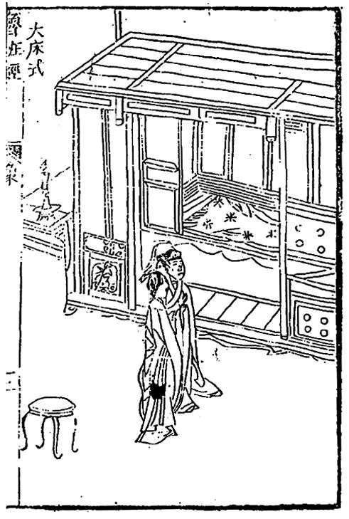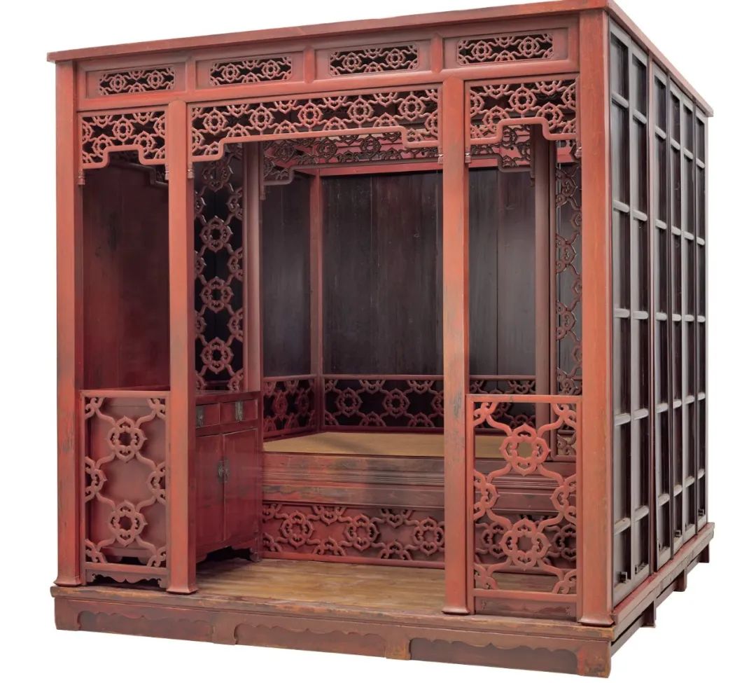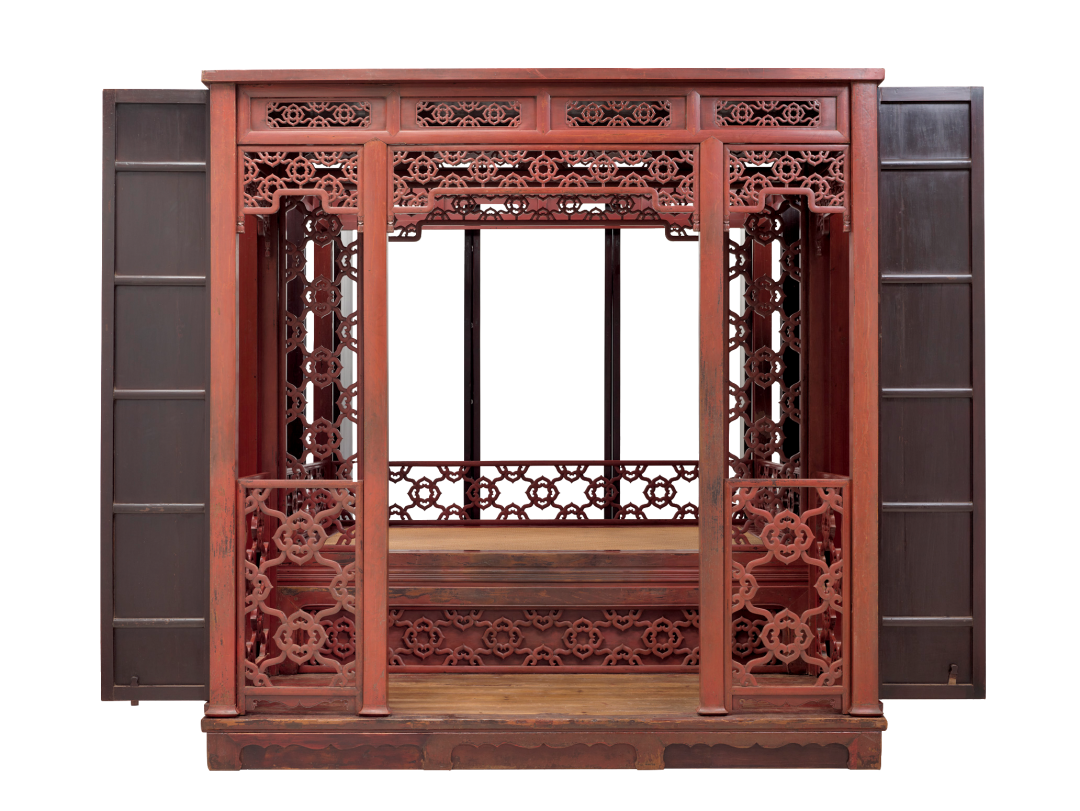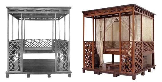 时月相侵,战火兵燹,部分形制的明式家具在黄花梨和紫檀家具里难以觅见,却在细木家具中流传下来。午荣(明代人,生卒年不详)《鲁班经匠家镜》论明代大床有大床式和凉床式两类,它们均属我们今天说的拔步床形制,两者分别在于大床式拔步床四边装有可开合围屏,而凉床式的则四面空敞,不设围屏。目前出版的收藏图录,传世的黄花梨或紫檀拔步床仅见一例,藏于Nelson-Atkins Museum of Arts[6](页343)。该床以黄花梨制作,属凉床式,大床式的未尝一见。本书藏品1榉木拔步床为大床式结构,四边围屏可开可合,保存完好,可补黄花梨和紫檀拔步床形制阙漏,让读者对明清床榻有更全面认识。