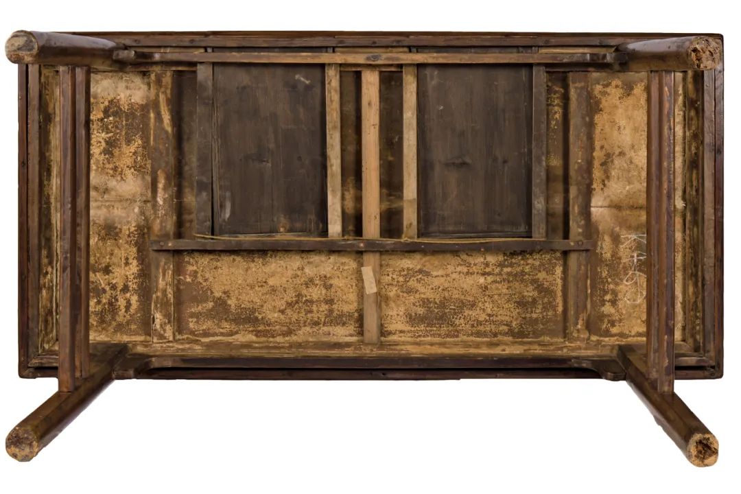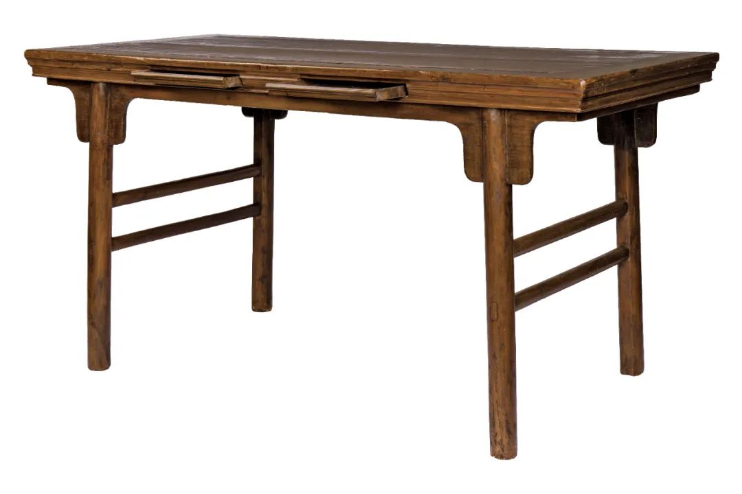 二、不落窠臼,时有新意。黄花梨和紫檀木材难得,必须小心运用。为材尽其用,工匠自然恪守绳墨,遵从成制,成品每多范式之作,少有标新立异之制,这是黄花梨和紫檀家具做工特点。细木家具,用材充盈,价格相宜,工匠可以驰骋高才,另辟蹊径,在传统规矩以外,力求变化,自出机杼,成品每有崭新之作。藏品52 榆木带抽屉夹头榫画案,外形和黄花梨画案无甚分别,它精巧之处在正面大边装有暗屉两具。李渔(1611-1680)《闲情偶寄》认为,家具应多设抽屉,便于摆放笔墨丹铅,也可用来存放废纸,以待来日付诸祝融[7]。这类带抽屉的画案在传世黄花梨或紫檀家具中,却是难得一见。