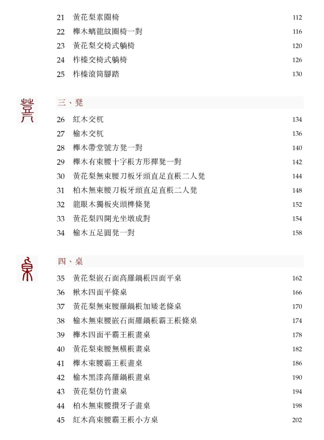 自此以后,明式家具成为中国古典家具研究专门用语,广为论者采用;明式黄花梨和紫檀家具,成为博物馆和收藏家致力入藏的珍品;坊间大众谈及明式家具,只是指黄花梨和紫檀家具。然而,明末至清前期,黄花梨和紫檀家具之外,其他木材的家具也不乏材美工良、造型优美的例子,它们同样展示浓厚明式家具气韵,合乎王先生明式家具定义,而且《明式家具珍赏》一书也录有榉木家具、柞木家具和漆木家具,材质不仅限于黄花梨和紫檀,如此看来,其他木材的家具,若是造型优美、材美工良,也可归入明式家具范畴。近二十年,黄花梨和紫檀家具仍是收藏家心之所好,其他木材的明式家具也渐受重视。这或是由于千禧年代开始,黄花梨和紫檀家具价格急升,教人可望而不可即,于是大家把目光转到其他木材家具上,特别是那些形制样式和黄花梨家具相近、深具明式风韵的遗珠。我们或以为这些家具传世数量多,收集起来不太困难,其实不然。它们瑕瑜相混、好坏杂陈,要从中觅得工艺精湛、卓具明式风韵的,犹如披沙拣金,既要耐心,也讲机缘,难以一蹴而就。本书收录其他木材的明式家具共66件,材质包括榉木、核桃木、龙眼木、柞榛木、榆木、柏木、红木、黄杨木、槐木、椿木和楠木等,现将它们联同14件黄花梨家具和1件紫檀家具,共81件家具一并编录于此,冀为明式家具爱好者,提供更多示例,资日后探索之用。明式细木家具