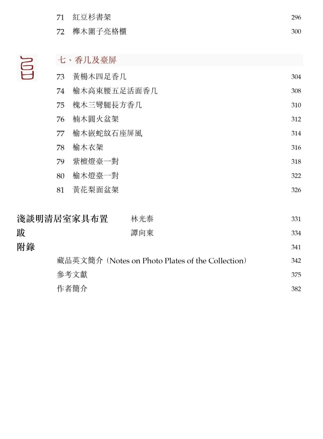 晏如居主人、香港著名收藏家刘柱柏医生,与同好,香港大学中文学院林光泰博士,一同品赏家具藏品精妙之处。明式家具向以黄花梨、紫檀为主。然而其他木材如榉木、榆木、楠木等,也不缺乏佳作精品,展现明式家具神髓,作者称之为明式细木家具。由造型线条以至形制变化、地域色彩和工艺手法,缕述出家具特色和优点,并辅以精美的古代画作和木刻版画,衬托出明式家具之生活气息,更为明式家具研究作进一步补充。为方便英语读者认识明式家具,书末特设藏品英文简介,以弘扬明式细木家具之文化底蕴。