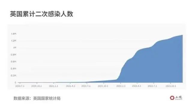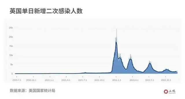 英国二次感染主要集中在第一波奥密克戎阶段,峰值曾达到2万人,即一天内便有2万人二次感染。而在后续几波疫情中,二次感染的新增人数逐渐下降,目前平均每天有1千人。