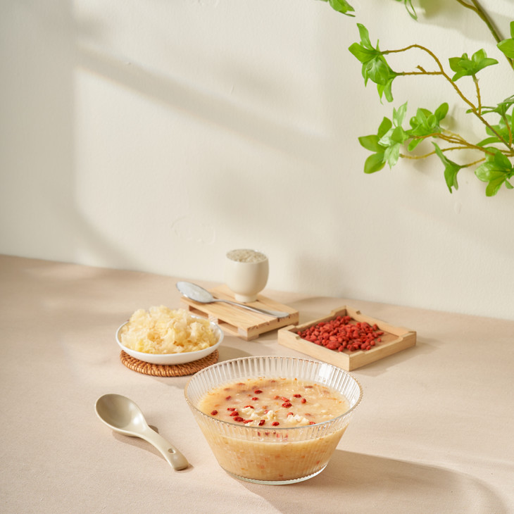 1、银耳提前洗净泡发,枸杞洗净,大米洗 净备用。