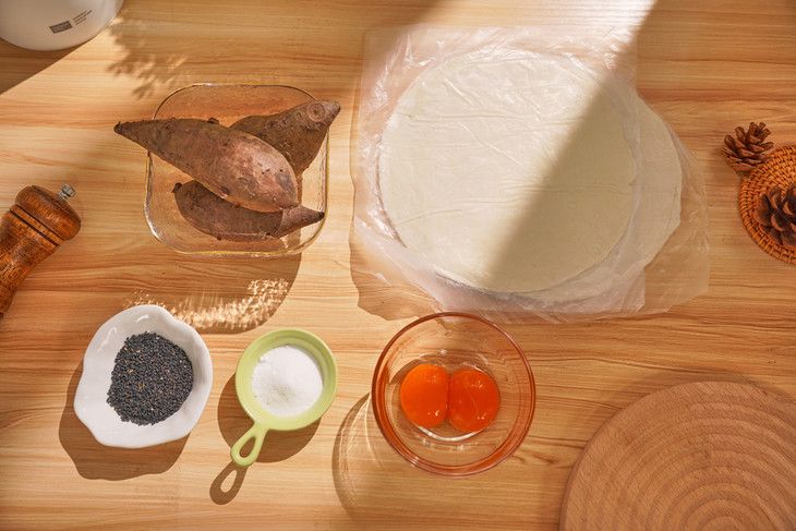3、随后翻面,表面涂抹一层蛋黄,单面撒上适量芝麻,放在空气炸锅纸盘中,温度调至180℃烤制五分钟即可