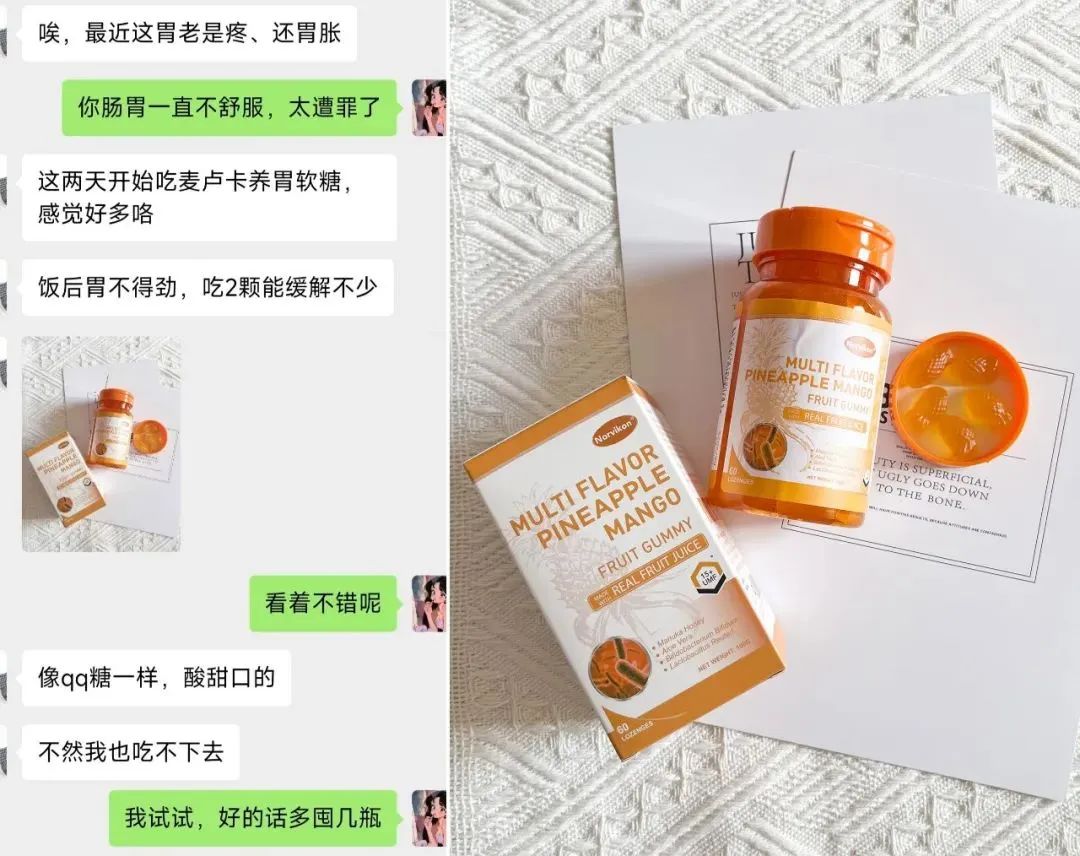 外卖党、爱吃油炸食物,胃部常隐痛、反酸、坚持吃养胃软糖,胃不酸了,吃饭有食欲了,嘴巴也香香的。