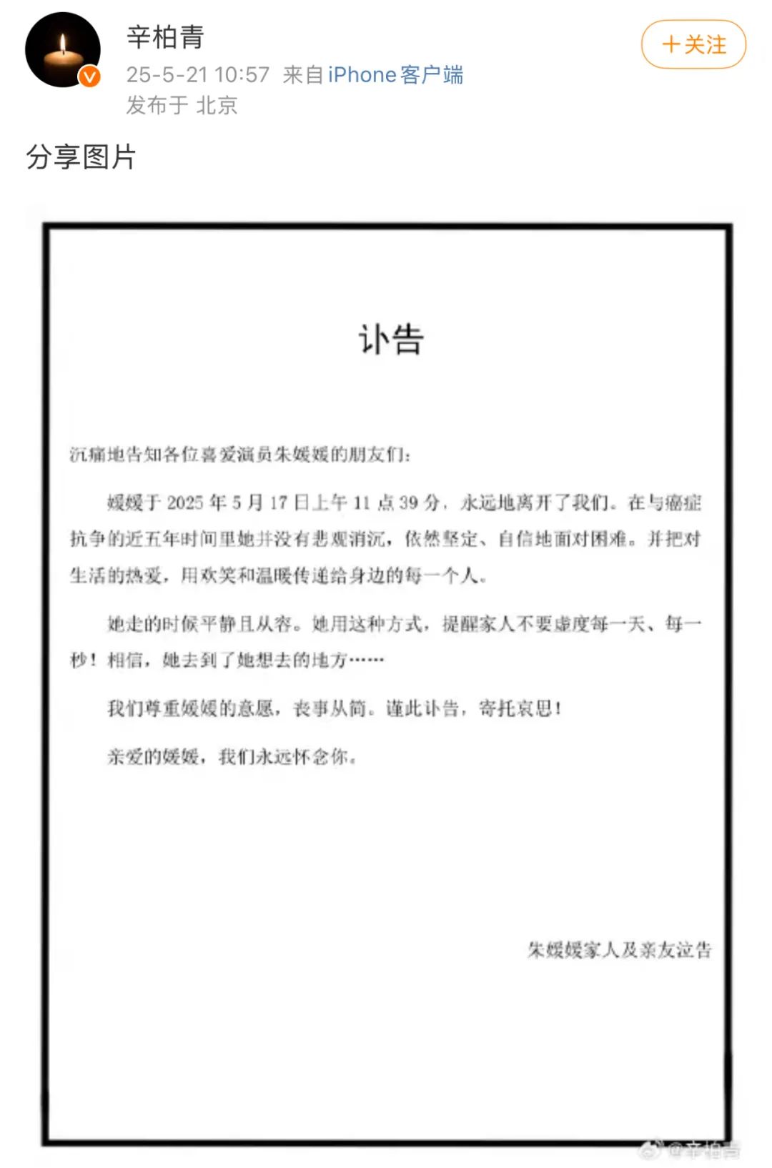 据悉,朱媛媛刚完成电视剧《造城者》的拍摄。剧组人员回忆,治疗期间她仍坚持研读剧本、参与讨论,将未尽的艺术理想都倾注其中。
