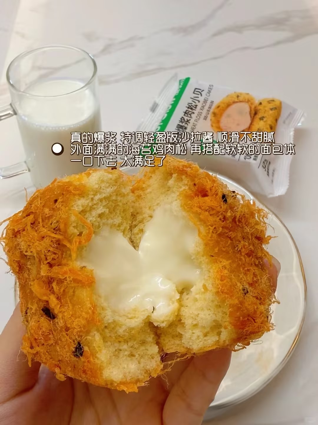 ✅松软蛋糕体+爆浆流心内馅,慢升糖燕麦小贝厚裹海苔纯鸡肉松,咸甜交织,一口爆浆超满足!
