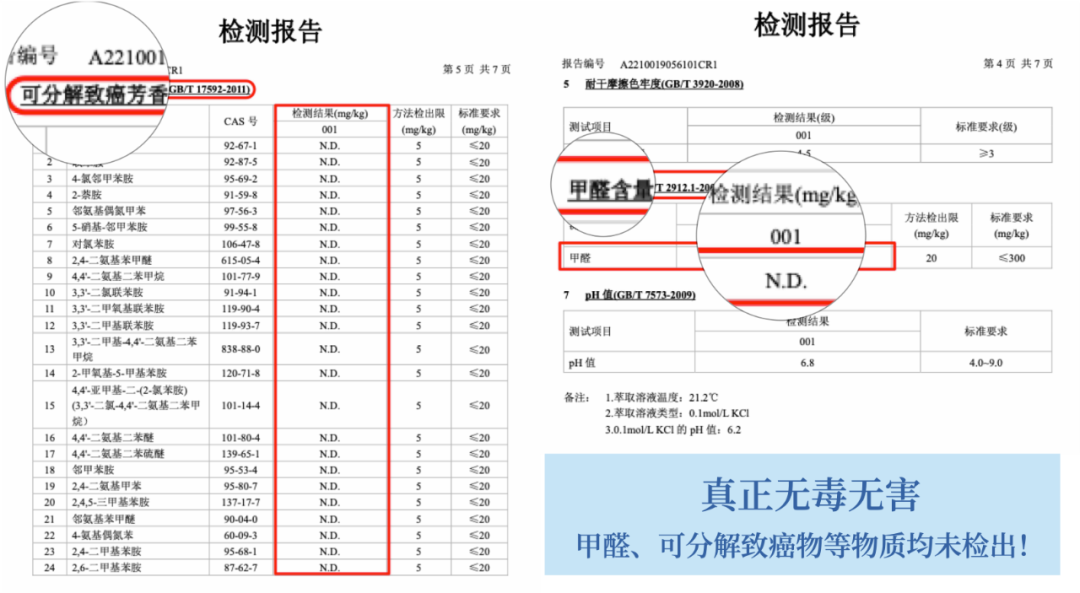 甲醛、可分解致癌物等有害物质全部未检出,大家可以放心使用~