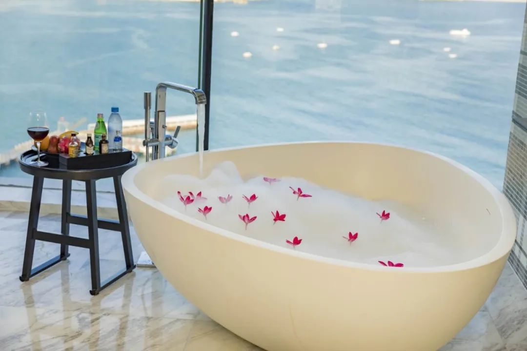 说到傲途格最出名的要属他家套房内的网红浴缸🛁!窗边的浴缸直面大东海湾,酒店还可提供房内玫瑰花泡泡浴服务,无需自己携带,真是很懂爱拍照的人的心思呢