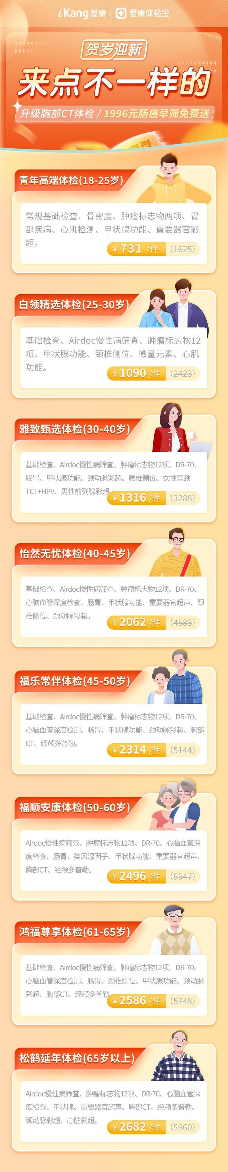 爱康国宾 松鹤延年 中老年体检包含听力(音叉)、人工智能视网膜影像检查、肝功十三项、糖化血红蛋白、血脂七项、DR-70、心无忧、C14、肿瘤标志物12项、颈动脉彩超、心脏彩超、胸部CT、经颅多普勒等检查项目,是一款适合60岁以上老年人全面检查的体检套餐。