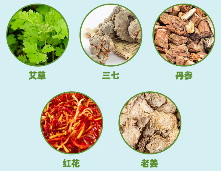 艾叶有温经散寒、祛湿暖宫的功效;益母草、当归可强化活血通经之效;肉桂有助于温阳散寒;丁香温中助阳,可治冷气腹痛;甘草则辅助补脾益气,缓急止痛。