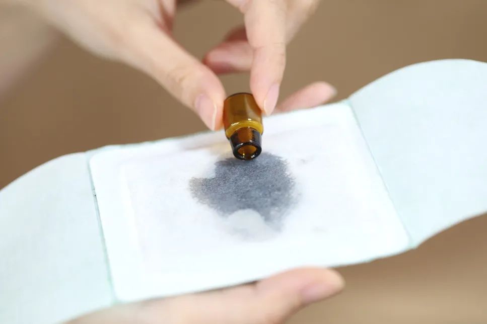 二滴:将艾草精油均匀涂抹在艾灸贴草本原料包上;