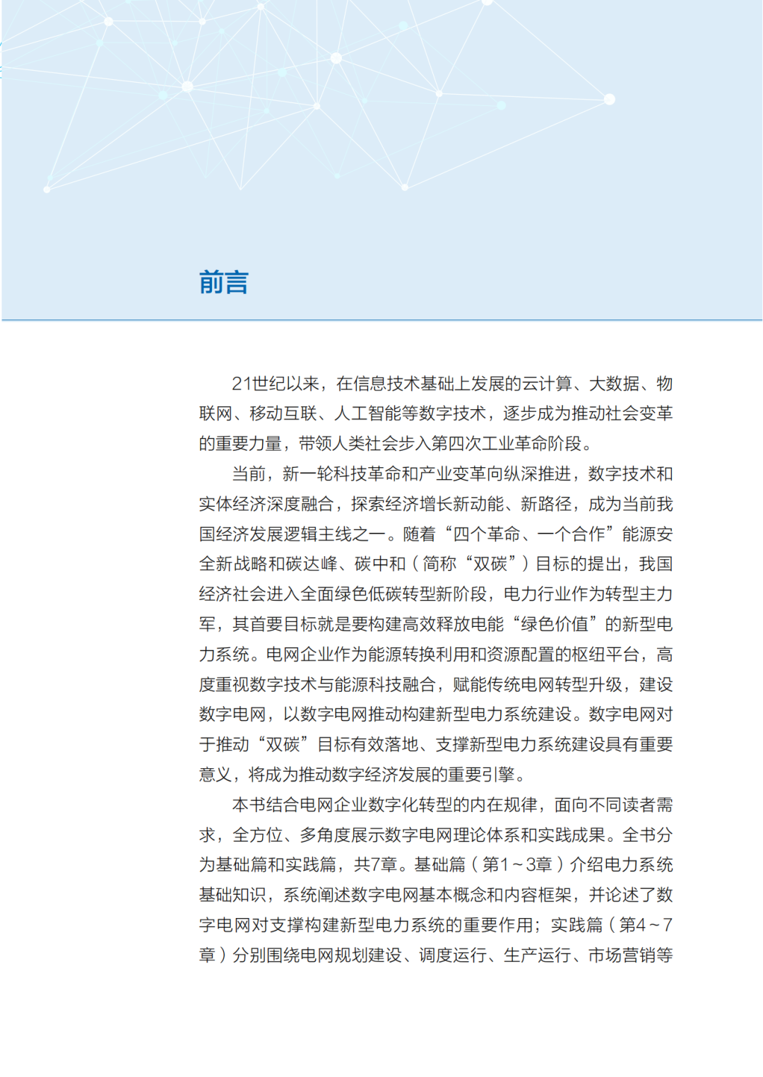 《数字电网基础知识与实践》是国内首本以“数字电网”为主题的出版书籍,兼顾普及性和专业性,既可作为电网企业管理人员、专业技术人员和数字化从业人员日常工作和学习的参考书,也可作为大专院校相关专业的教材。