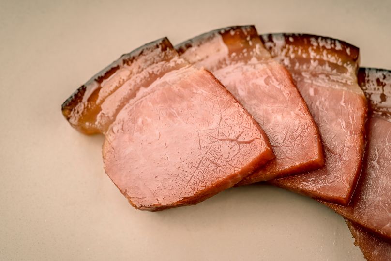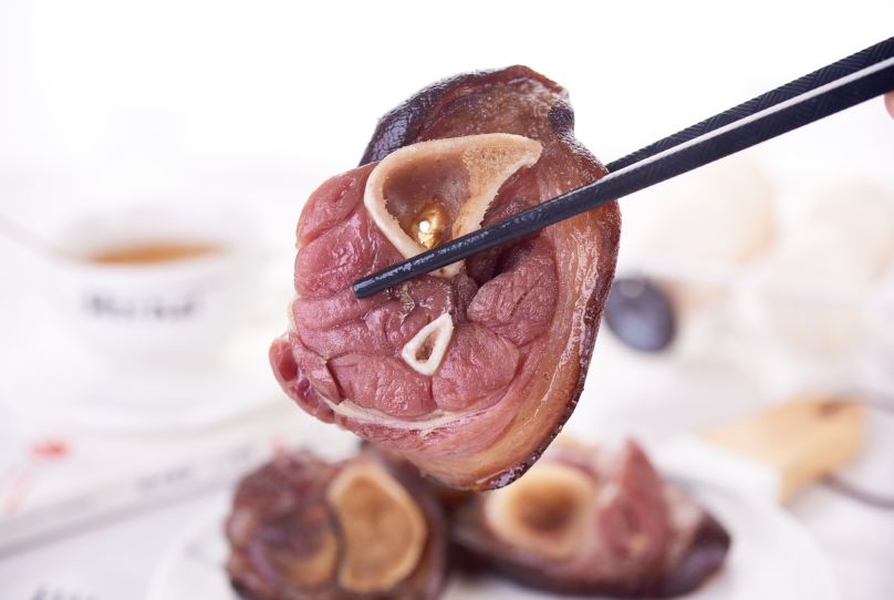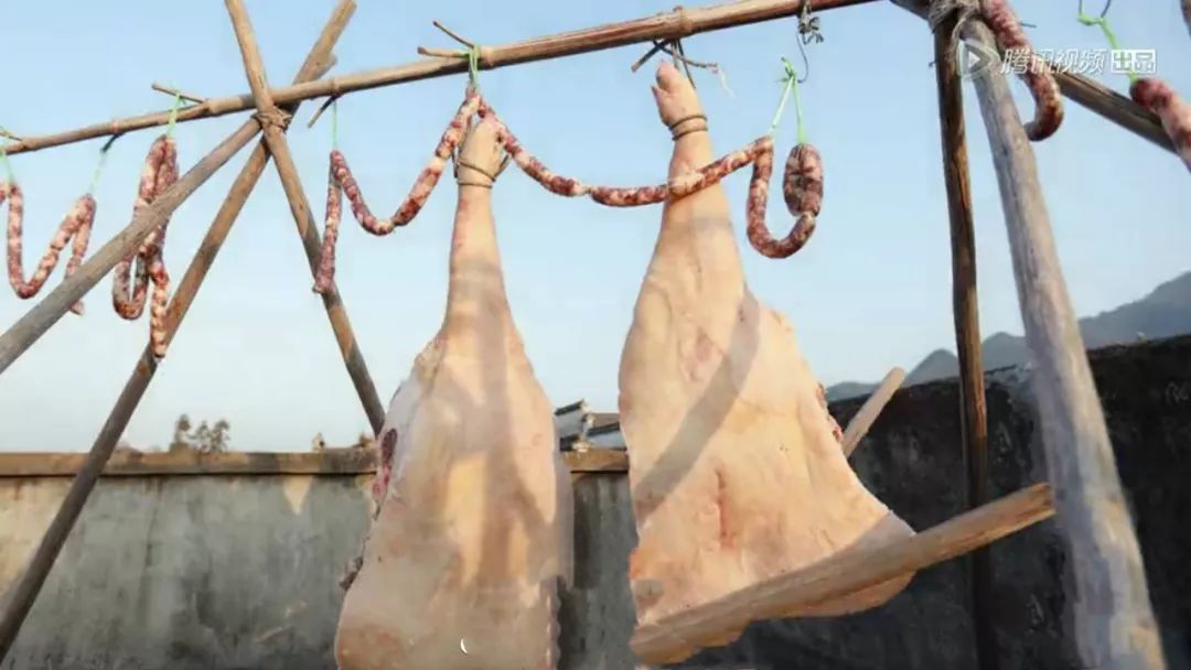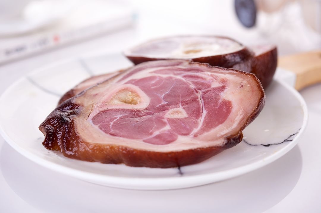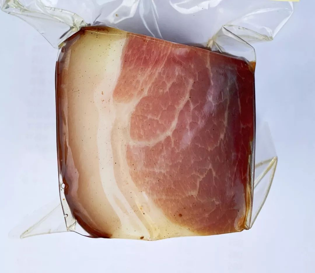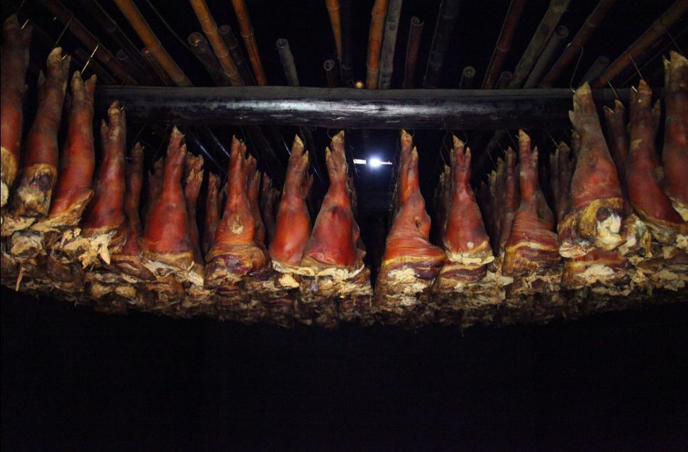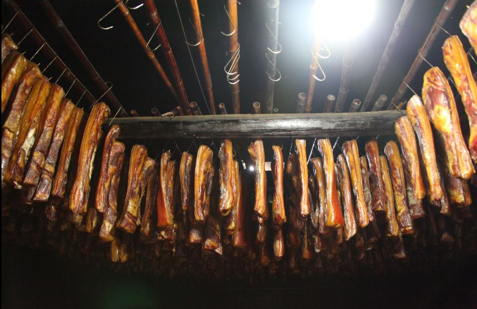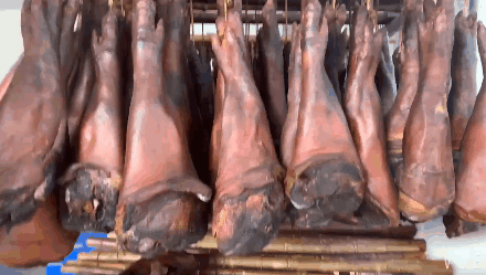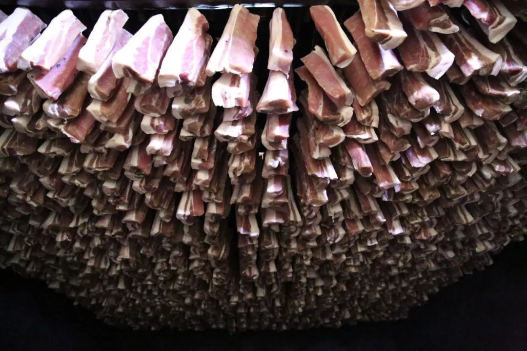 经过冷熏工艺制成的腊蹄髈和腊肉,经过捶打,充分入味发酵,切面呈现诱人的颜色和花纹,味道堪比火腿。