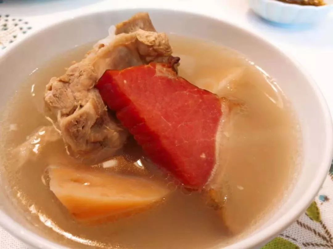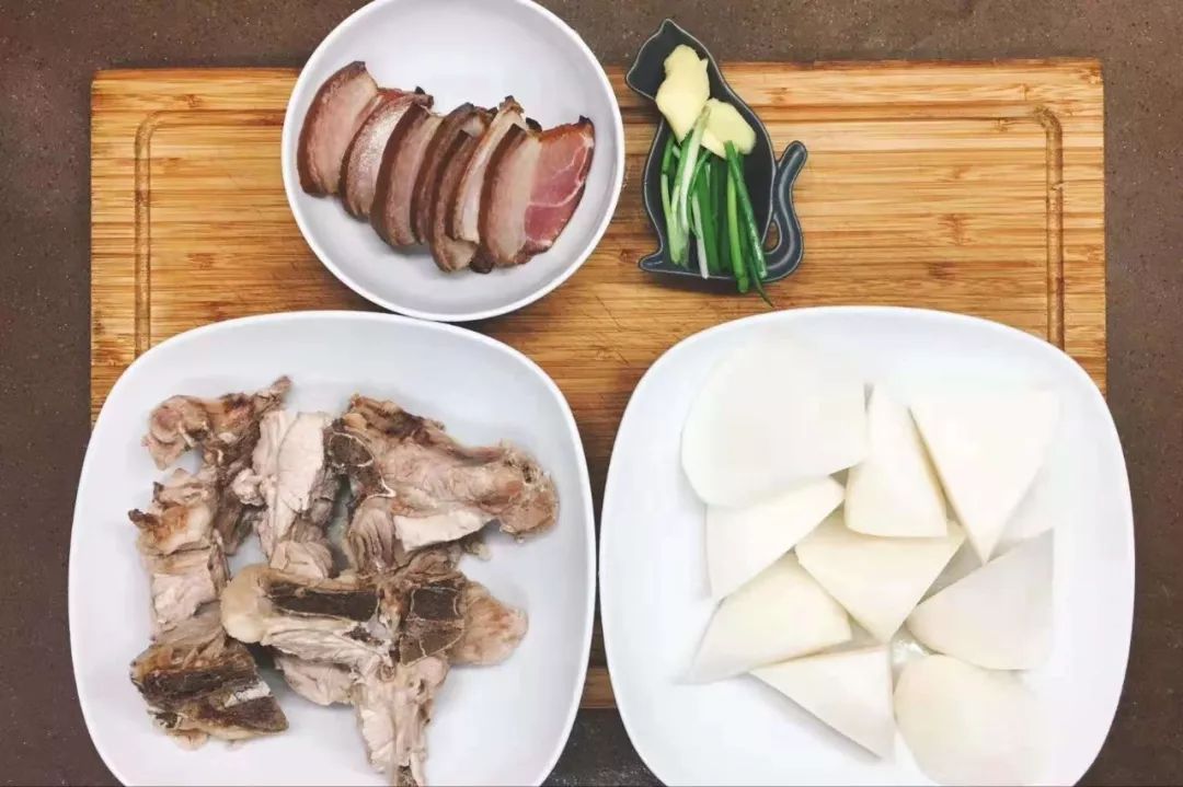 做法:腊肉切片,煸炒出油,下入蒜片爆香,后下焯水后的猪脊骨煸炒出香味,然后加入水小火慢炖20分钟,萝卜块炖20分钟,起锅撒上白胡椒粉,香葱末,可根据口味加或不加盐均可。