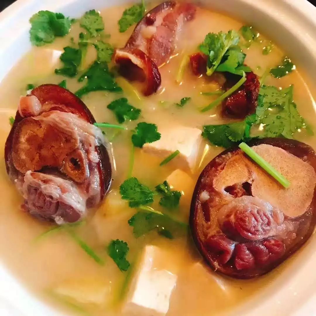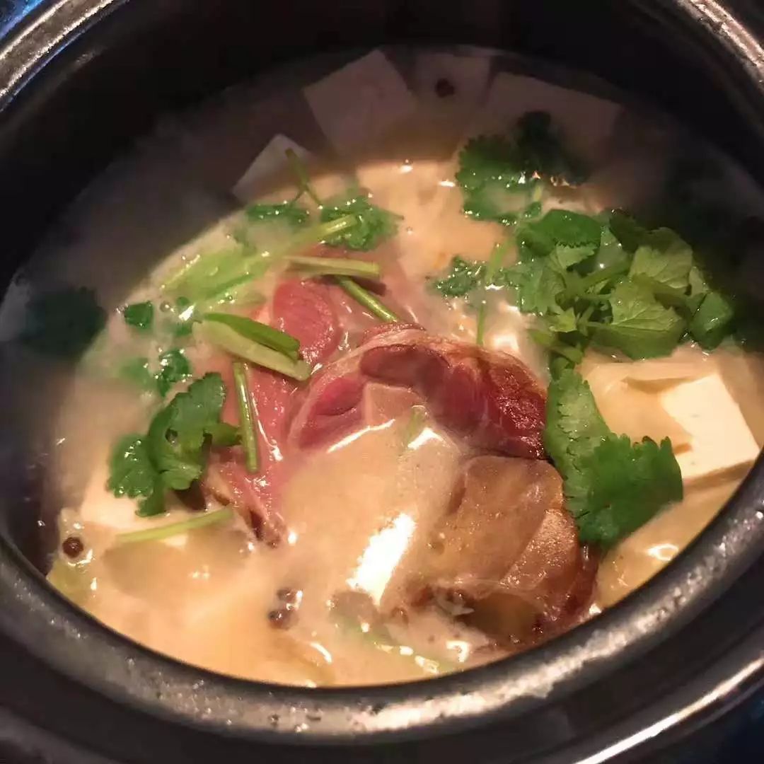 做法:腊猪蹄泡2-3小时;热锅放少许油、葱段姜片花椒炒香后放入猪蹄翻炒一下加入热水斤砂锅开炖;40分钟后加入豆腐块、土豆;30分钟左右关火、放香菜。