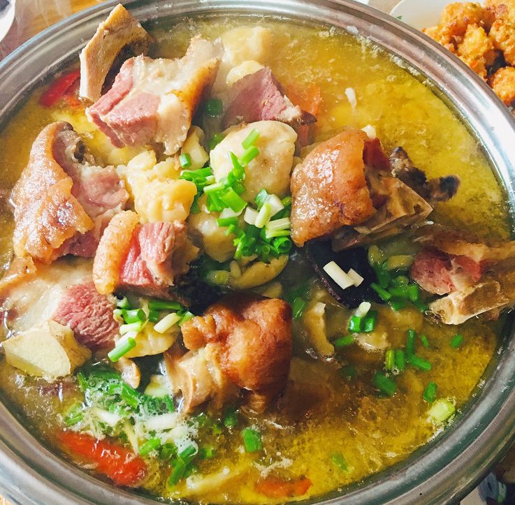 做法:锅底少许底油,烧热放入姜片+葱段+花椒炒出香味,后放入半袋腊猪蹄,也可混搭腊排骨;腊猪蹄煸炒片刻后放入热水炖40分钟后,下入豆腐块(强烈推荐多方)、土豆块炖15分钟,装入火锅上桌;火锅吃完豆腐土豆可以涮各种蘑菇和青菜,喜欢麻辣的朋友可以用天赐家的调料配置出美味的蘸水。