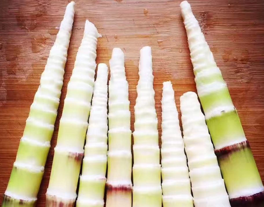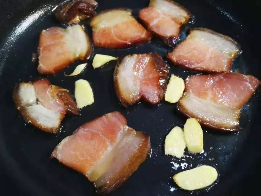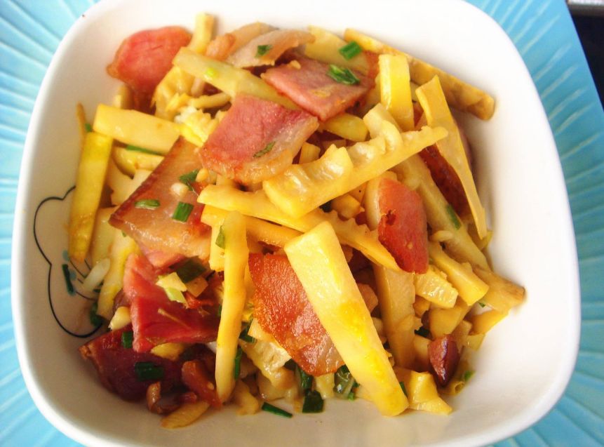 做法:将笋段切成两半,再改刀切成薄片,放入沸水中焯烫一下,然后沥水捞出;腊肉切薄片,放入油锅中慢火炒出香味,看到肥肉部分开始变色卷曲,即可捞出;将余下的油继续加热,直到5成热时,放入焯好的笋片,翻炒均匀,然后加入炒香的腊肉,加入3克盐、5克白糖拌匀;最后出锅前撒上适量香葱即可。