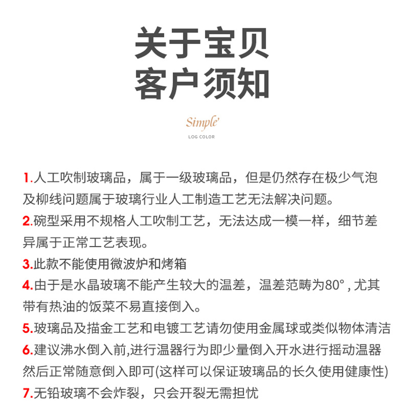 使用说明:水晶玻璃不能产生巨大温差,温差范畴80℃,不能进微波炉、烤箱加热、洗碗机使用。