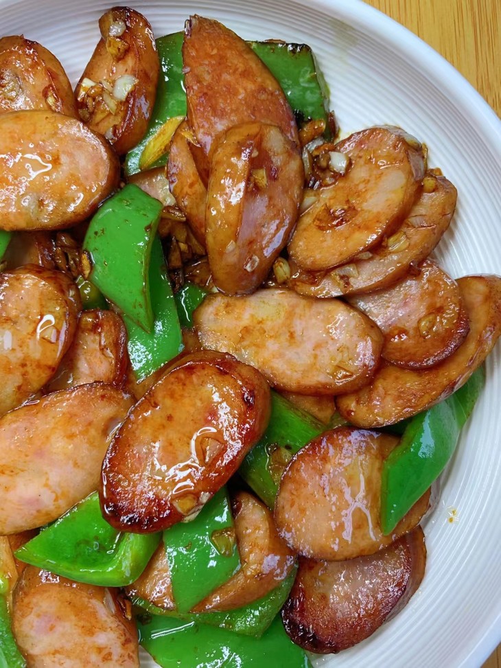 做法:锅中烧油爆香蒜末,倒入青椒翻炒,再加入红肠翻炒,再加入1勺蚝油,1勺糖翻炒均匀出锅,按自己口味放盐🧂哦