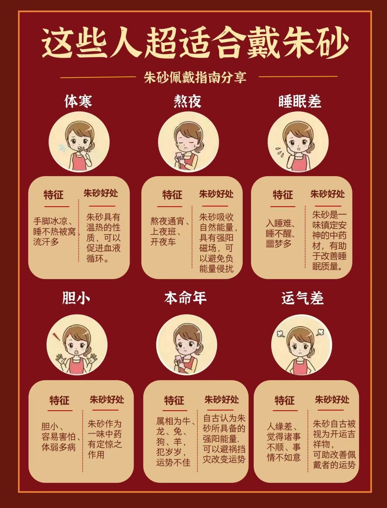 镇心安神:中医理论认为,朱砂色赤入心,能镇定心神。佩戴于腕部,通过皮肤接触和能量共振,有助于平复情绪、缓解焦虑。