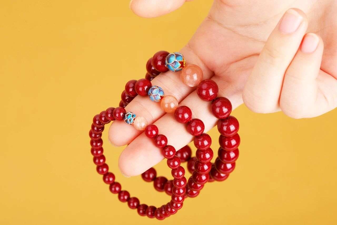 金珠隔珠朱砂手串是朱砂+金珠+景泰蓝莲花的组合款,是一款融*合传统与现代设计的饰品。