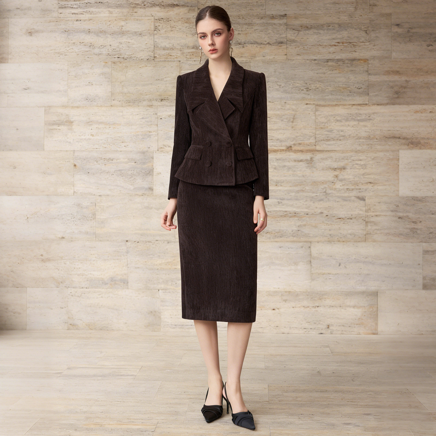 当美拉德的暖调撞上丝绒的柔,再叠上大领子 + 双排扣的复古骨架 —— 这套雪尼尔两件套,直接把「职场优雅」和「秋冬氛围」焊在了一起。